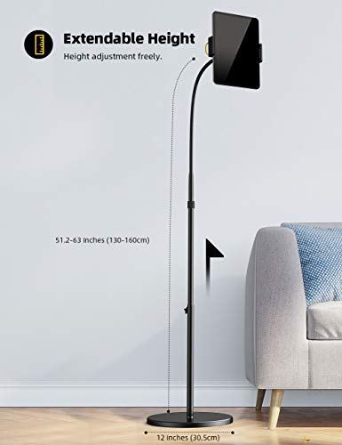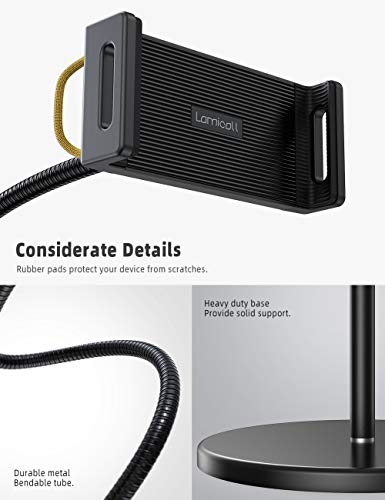 - 【Strong Stability】 4.8kg (10.6lb) heavy duty base makes the stand more stable and reliable in any position. Made of premium aluminum alloy, the gooseneck arm and extension tube are more durable than usual. Lamicall tablet floor stand offers safe and secure support for your device.