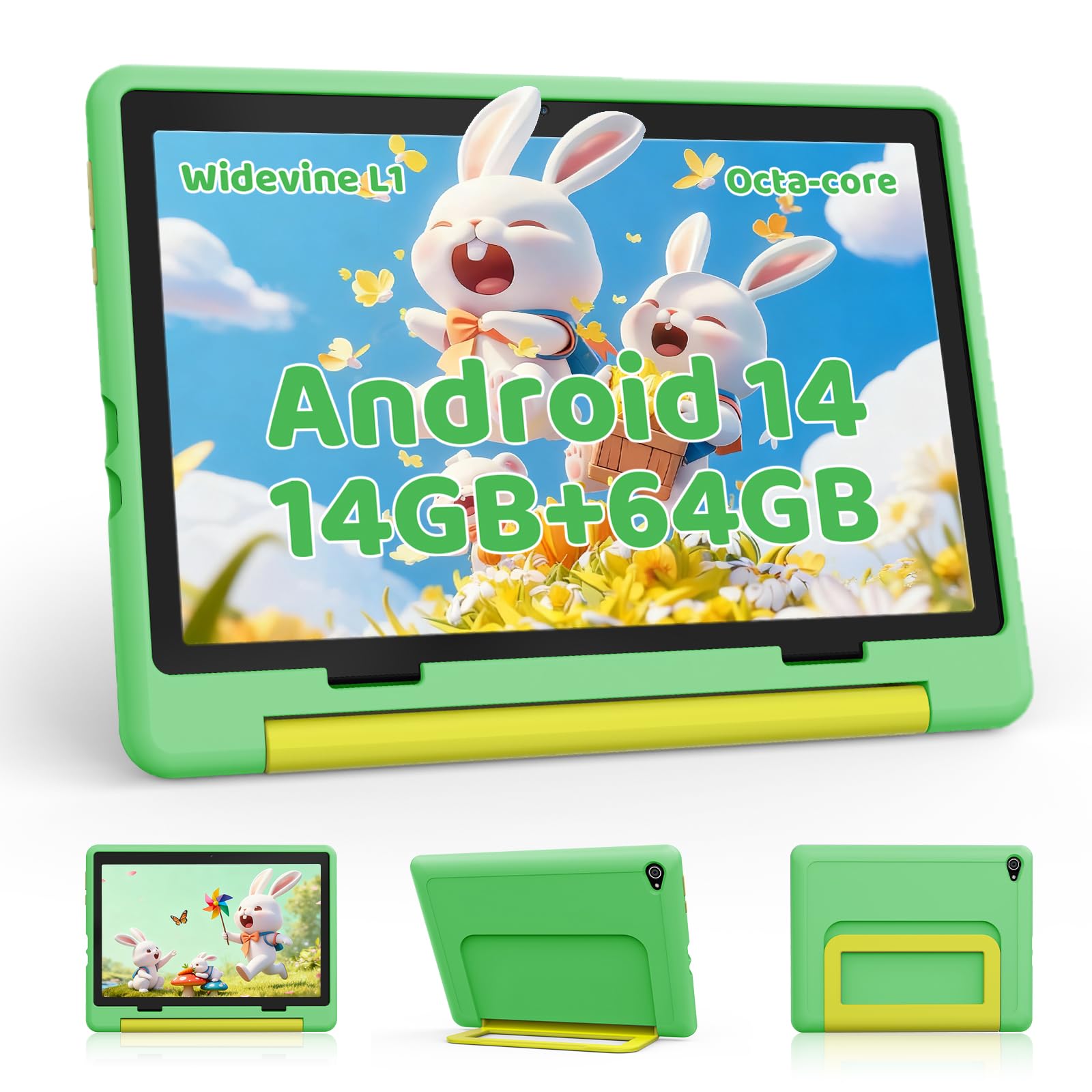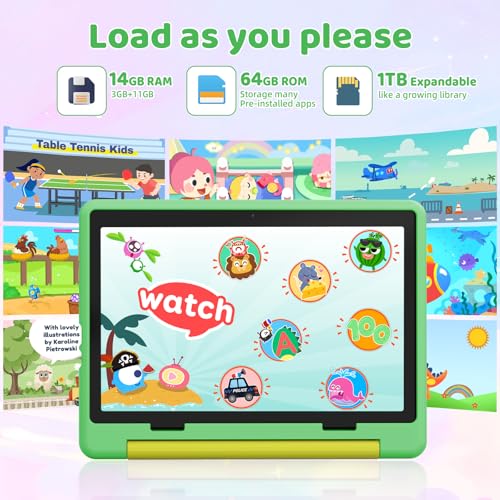 - 【Kids Tablet with 14GB + 64GB + 1TB Large Capacity】This tablet for kids is equipped with 14GB RAM (3GB physical memory+11GB virtual expansion) and 64GB high-speed storage space, running smoothly and easily handling multitasking, learning, reading, watching movies and games. More support for microSD card expansion (card needs to be purchased separately, up to 1TB), massive storage space for photos, e-books, movies and other resources at will, no need to worry about insufficient space.