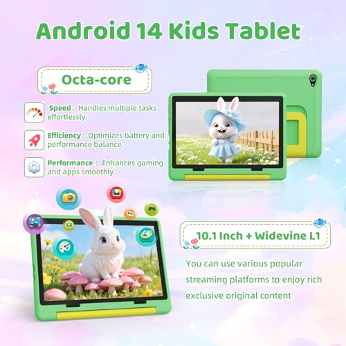 - 【Equipped with Android 14 & 2.0GHz Octa Core CPU】This 10 inch kids tablet runs on the latest Android 14 platform, significantly optimizing system smoothness and reducing power consumption. Android 14 also brings enhanced privacy protection features, finely controlling application permissions and personal data, allowing parents to easily manage application permissions and child data security. Its built-in 2.0 GHz octa core processor ensures strong performance, eliminates lag, and supports seamless multitasking.