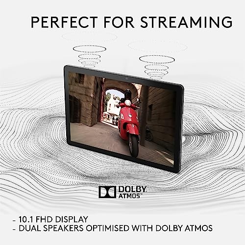 - Family tablet covered in Storm Grey color with vibrant, 10.1-inch WUXGA (1920×1200) display and dual speakers optimized with Dolby Atmos. Bumper Case included to the tablet.
