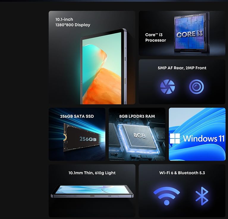 LMHTRADE Win 11 Tablet core i3 (up to 3.4GHz), 8GB RAM 256GB SSD, 2 in 1 Tablet 10.1″, WiFi 6, Bluetooth 5.2, Dual Camera,1280X800 HD IPS,HDMI,Type C,USB3.2(with keyboard)