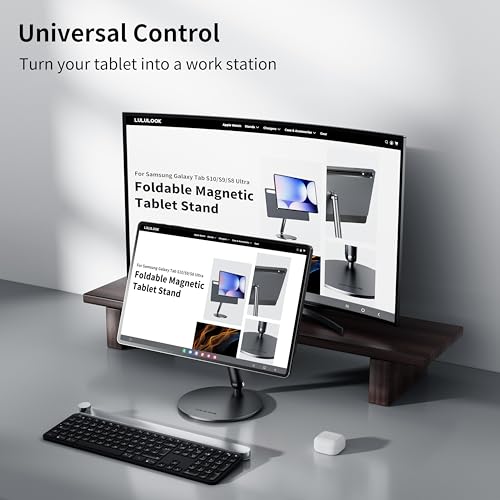 - [Full 360 Adjustable Stand] Featuring 360 degree adjustable panel and base, this Galaxy Tab S10/S9/S8 magnetic stand easily fits portrait or landscape mode or any angle you like. The 360-degree rotating base makes a pleasant clicking sound, and the top and bottom hinges allow for easy angle adjustment and a fully folded shape. Lululook Galaxy Tab stand matches you at the optimal eye level, whether you're drawing, playing games, watching videos or taking photos