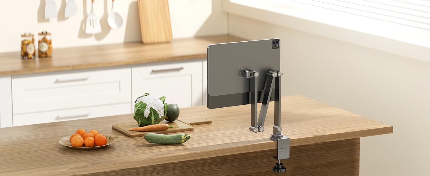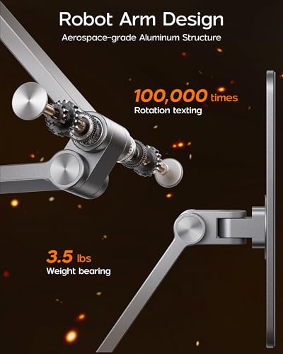 - Build to Last: Machined from a solid block of aircraft-grade aluminum, every 8mm-thick, 3cm-wide arm is precision-CNC'd and anodized to survive 100,000 rotations with zero joint loosening (prevents iPad drops!), securely hold up to 3.5lbs, and bite firmly into surfaces up to 1.97in thick—locking rock-solid stability for recipes in kitchens, workflows at desks, art sessions in studios, or movie nights in bed
