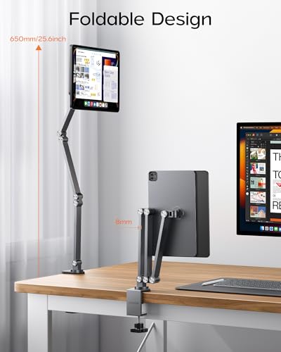 - Engineered for Total Control: Bend joints to sketch flush at 0° tilt, or extend to 65cm for standing workflows. Our 4-joint arm system delivers precision rotation and tilt—perfect for drafting, streaming, or collaborating. This iPad Arm Mount can collapses to Compact Form — Engineered for Space Efficiency. Minimal mechanics, maximum versatility—wherever your iPad creates