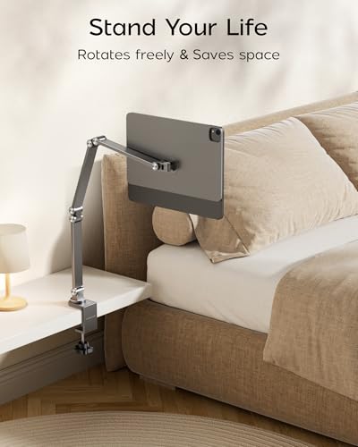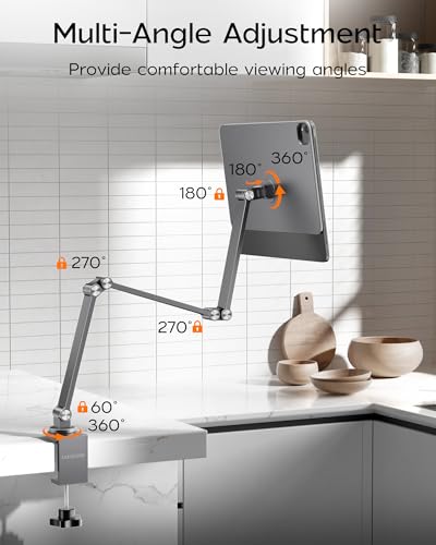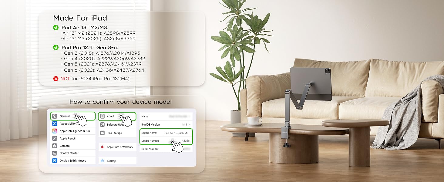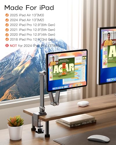 - Rock Steady Always: This ipad desk mount has been extensively tested, precision-tuned damping joints lock your iPad without shifting—zero bounce, drift, or wobbles—while dual-textured silicone pads dual-defend with vice-like grip on any surface + scratch-proof cushioning, eliminating slips and desk damage. **Stiff to adjust? Safety design.Grip both joints with both hands to adjust (Fig.7) **