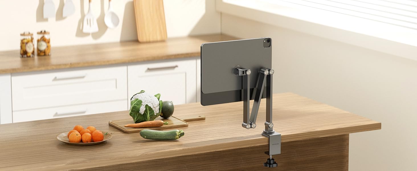 - Build to Last: Machined from a solid block of aircraft-grade aluminum, every 8mm-thick, 3cm-wide arm is precision-CNC'd and anodized to survive 100,000 rotations with zero joint loosening (prevents iPad drops!), securely hold up to 3.5lbs, and bite firmly into surfaces up to 1.97in thick—locking rock-solid stability for recipes in kitchens, workflows at desks, art sessions in studios, or movie nights in bed, our magnetic ipad mount will meet all your needs