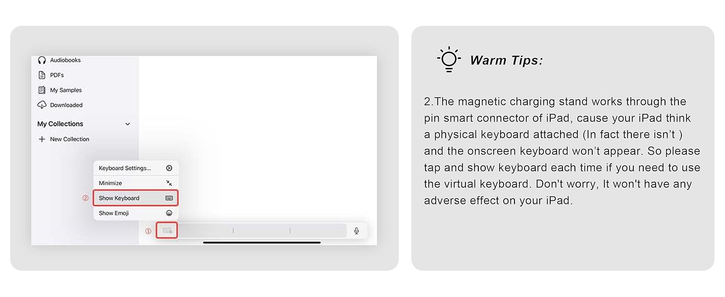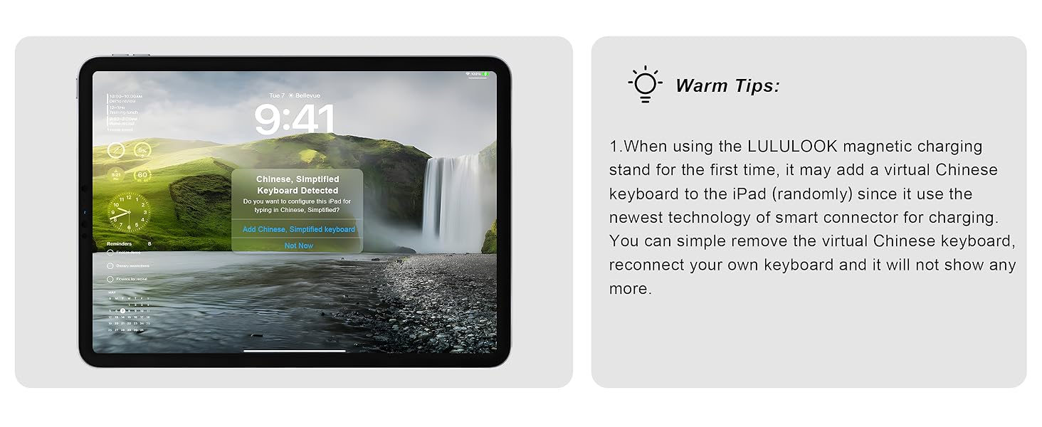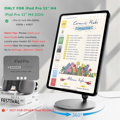 - 【JUST FOR iPad Pro 11 Inch M4 (2024)】The magnetic iPad stand ONLY works with iPad Pro 11 inch M4 (2024). NOT for other versions of iPad or Android tablets. HINWEIS:①This iPad 11 stand is NOT compatible with iPad Air 11 inch M2 (2024). ②Please make sure your protective case is a magnetic protective case or without a protective case. ★Special Note: The charging function is not compatible with iPadOs Beta series