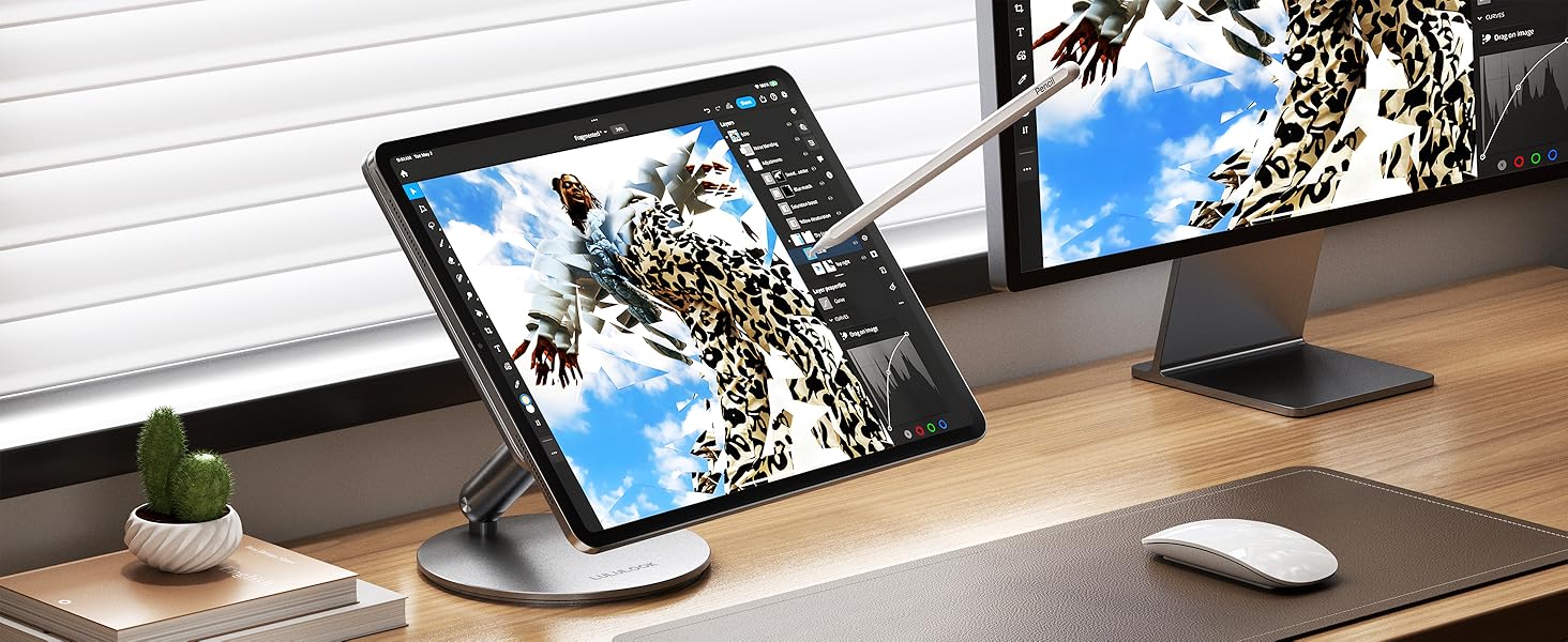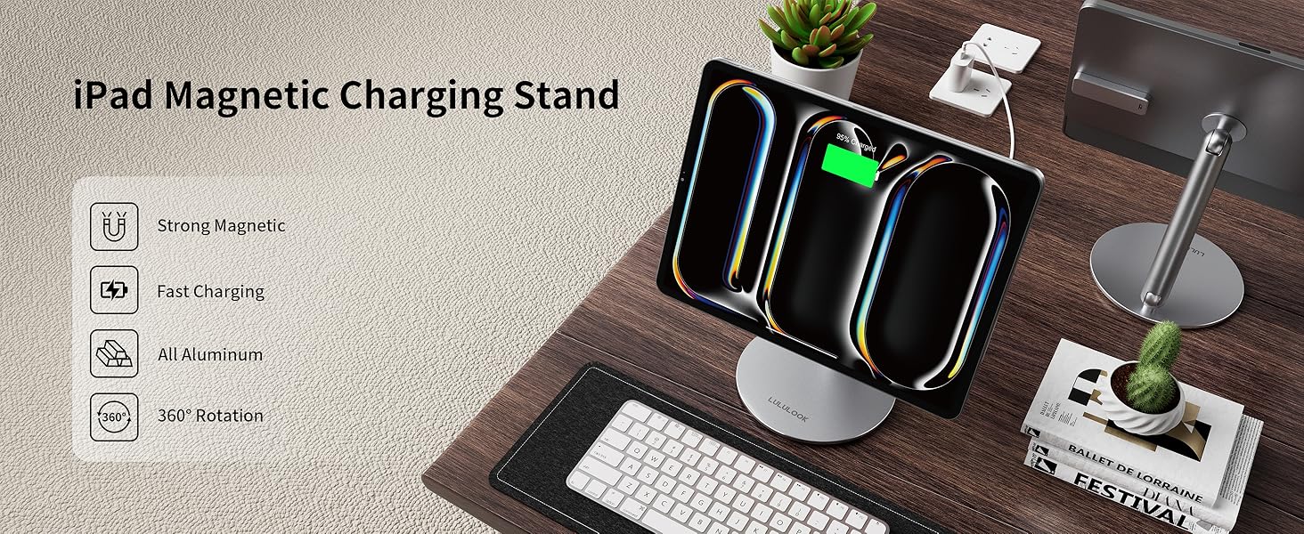 LULULOOK Wireless Charging Magnetic Stand Only for iPad Pro 11 inch M4(2024),360°Adjustable Desk Stand Foldable Aluminium Tablet Stand for iPad Pro 11″ M4(1M USB C Cable Included)