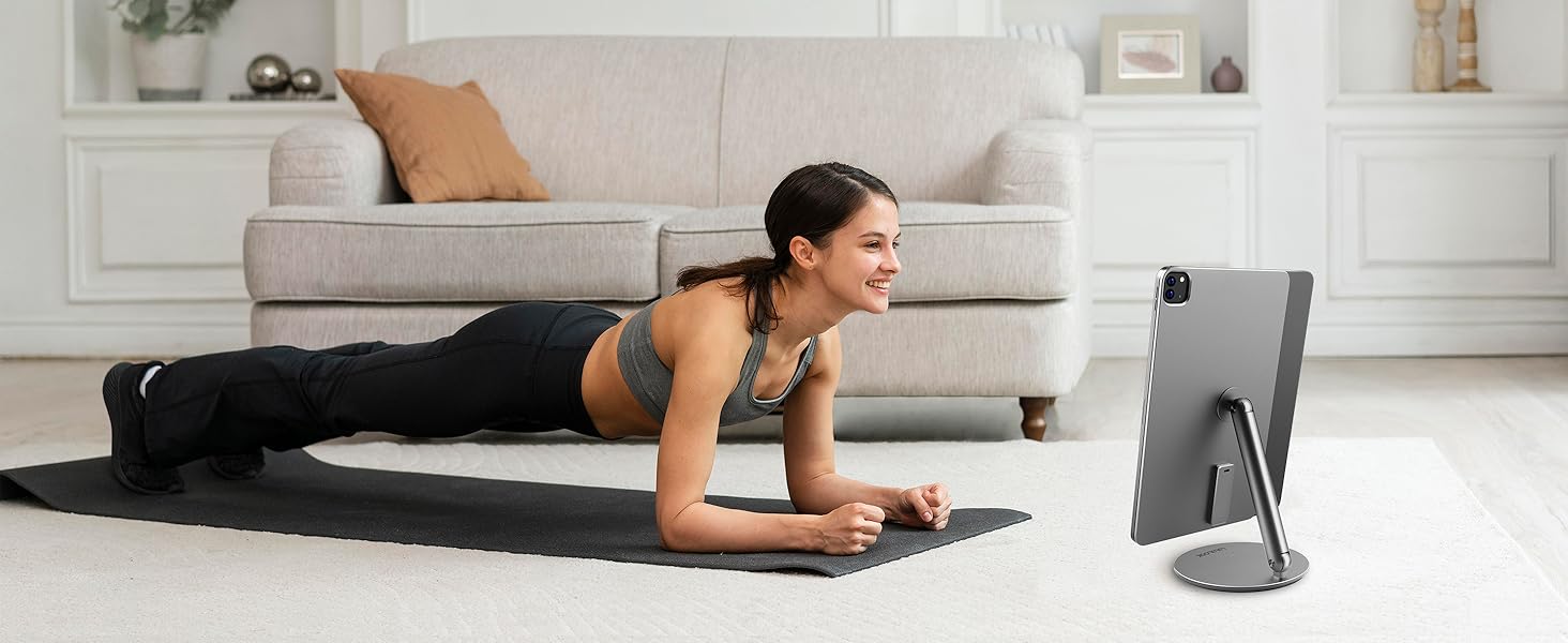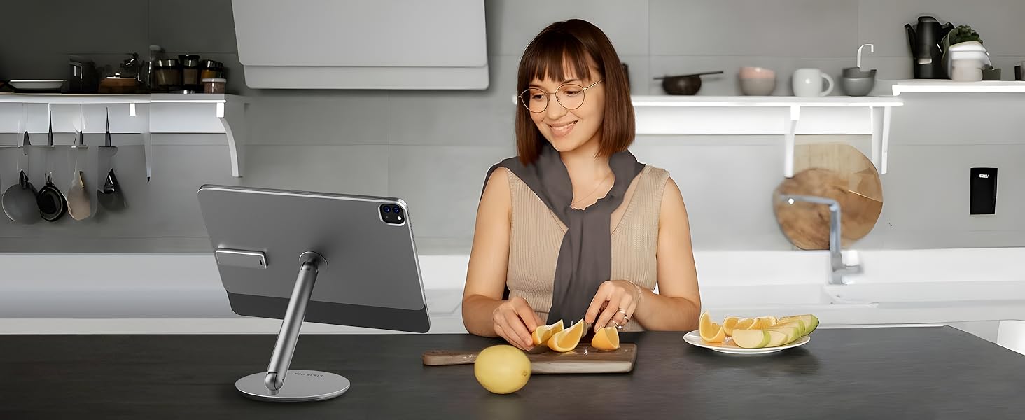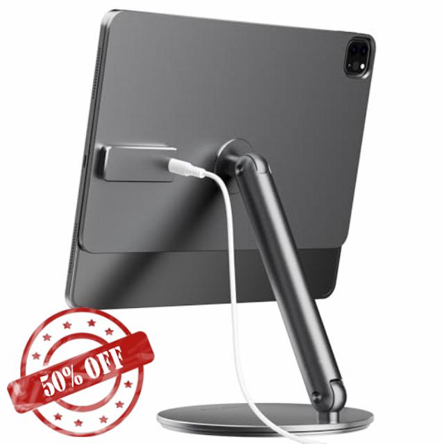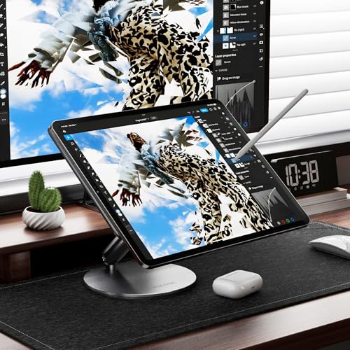 - 【360° Invisible Base】Our tablet stand is distinguished by a 360° rotating circular base and a rotating mechanical arm. Made with acoustic damping material, the stand reacts quickly to every rotation, viewing both vertical and horizontal. This makes it very useful in the kitchen and when using the iPad as a cash register system (POS). Mechanical gears are heard when the base of the stand rotates, for an aesthetic quality feel.