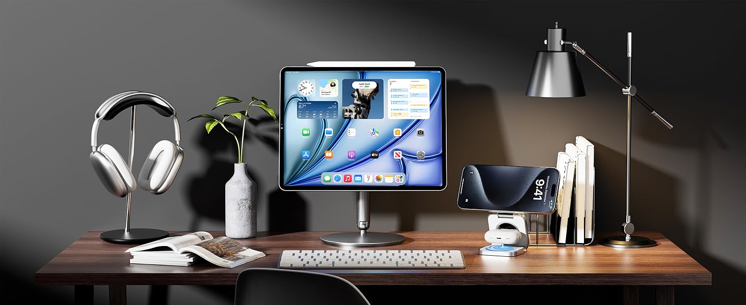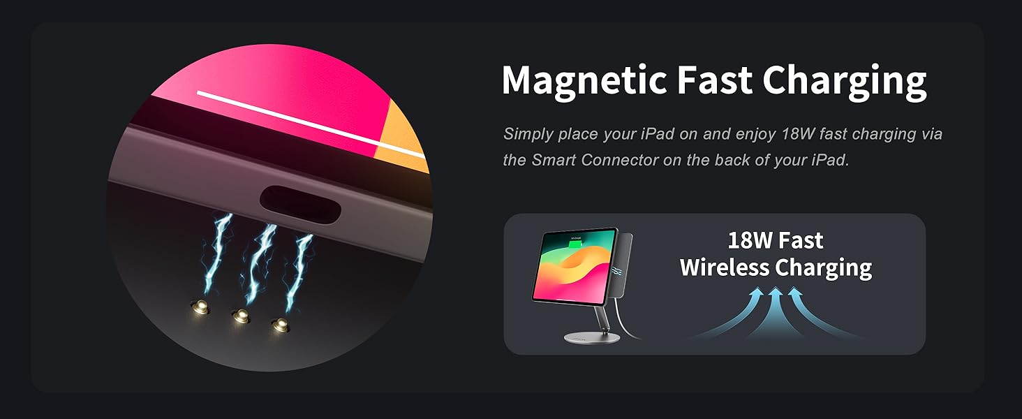 - 【18W Fast Charging】Our new version of the iPad Pro 11 inch M4 (2024) stand has added smart connectors on the magnetic tray and a USB C port on the back. Smart pin connectors allow fast charging up to 18W for iPad, place your iPad on it and enjoy wireless magnetic charging (1M USB C cable included, adapter not included).