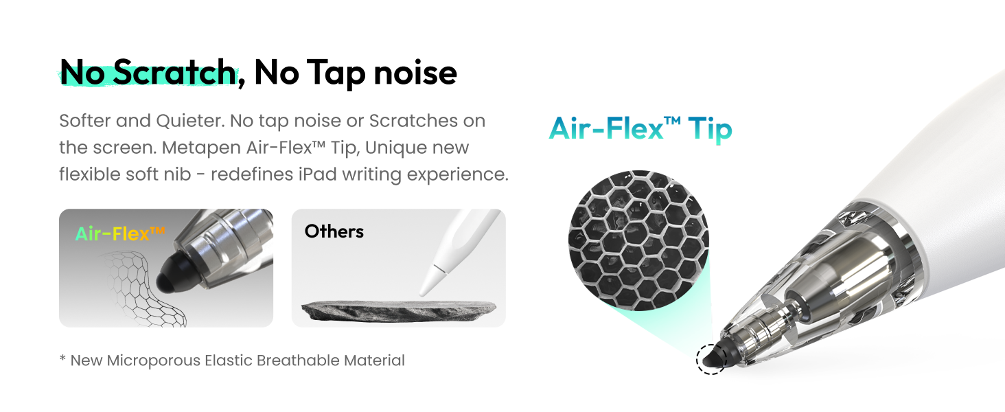- 【All-New Air-Flex Tip for Quiet, Paper-Like Writing】:Metapen presents the world’s first Air-Flex soft tip with micro air chambers, creating a paper-like feel with gentle resistance on the iPad screen. Softer than traditional hard tips, it glides smoothly without scratching and stays as quiet as 25 dB, enabling writing that won’t disturb others. Each Air 8 Pro comes with 3 Air-Flex tips for long-lasting use