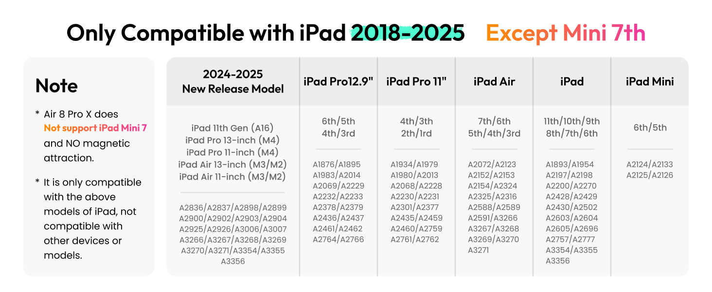 - 【Make Sure Your iPad Model is Compatible】: Air 8 Pro iPad pen is ONLY compatible with the iPad models below: iPad 11/10/9/8/7/6 Gen, iPad Pro 13 inch M4, iPad Pro 11 inch 1/2/3/4/M4, iPad Air 3/4/5/M2/M3, iPad Pro 12.9 inch 3/4/5/6 Gen, iPad Mini 5/6 Gen. NOTE: ❌NOT for iPads before 2018, iPad Mini 7th, iPhone, Android or Microsoft devices. Please check your iPad model before ordering