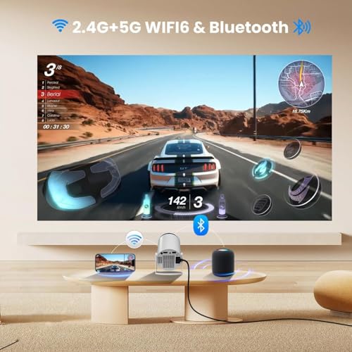 Mini Projector with Bluetooth, 4K Support 130″ Screen Movie Projector with Auto Focus & Keystone, 5G+2.4G WiFi 6 Connection, 180° Rotatable Vision for Home Cinema, Laptop, Smartphone