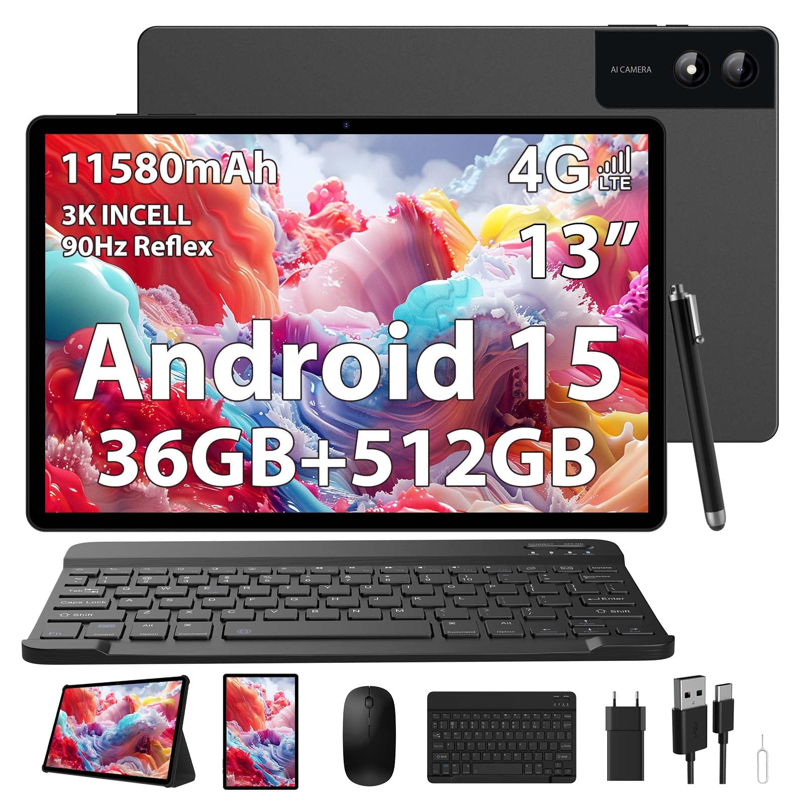 PIXPEAK 3K Tablet 13 Inch & Android 15, 36GB RAM, 512GB ROM (Expand TF 1TB), 4G Lte & 5G WiFi, 2940 * 1840, 11580mAh, G99 2.2GHz, 13MP+8MP, Tablet with keyboard/GPS/Bluet/4 Speakers-Black