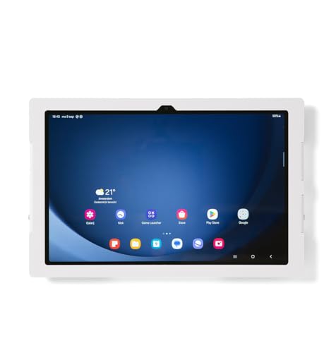 - The Tabdoq Samsung Galaxy Tab A9+ stand can be securely fastened to the table or counter. The tablet itself is protected on all sides by the metal tablet enclosure. This enclosure consists of two parts that are secured together using two screws on the sides.
