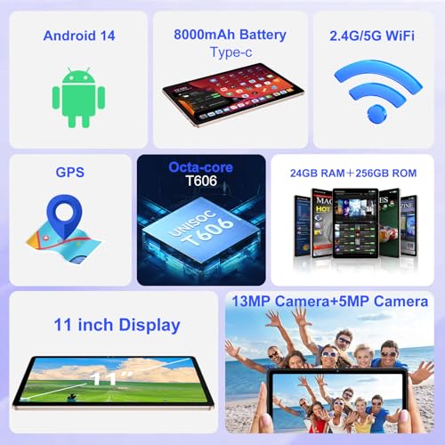 Specification: System: The Android 14 system Processor: High-performance octa-core processor Memory:24GB RAM 256GB ROM 1TB Expand Screen size:11 in Battery: 8000mAh Camera: 13MP Rear and 5MP Front Resolution: 1280×800 connection:5G&2.4GHZ WiFi Bluetooth: 5.0 Charging interface type: Type-C Headphone jack type: 3.5mm Remarks:Package Included: 1 *Android 14 Tablet 1 * Protective case 1 * Tablet Charger 1 * Tablet Charging Cable 1 * Protective film 1 * Box 1 * User Manual Notes: This is a WI-FI tablet without SIM card slot