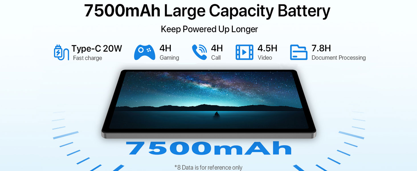 - & : The 11 inch tablets andriod comes with 7500mAh battery and 20W fast charging ensures you’re never out of action for too long. Whether it's for work or play, this tablet's power is built to keep up with your lifestyle