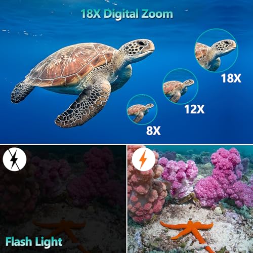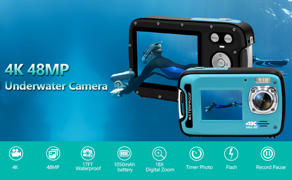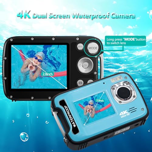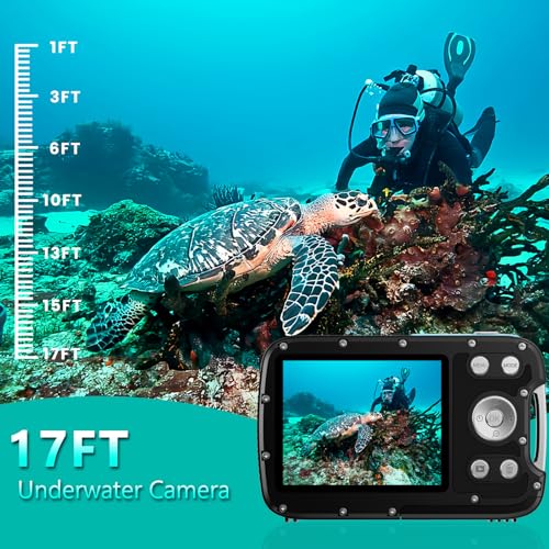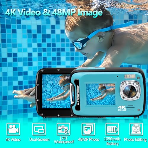 Underwater Camera 17FT 4K 48MP Waterproof Camera for Snorkeling,Dual Screen Auto Focus Digital Camera with 32GB Card,18X Zoom Fill Light Compact Cameras