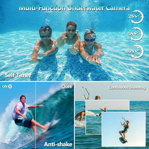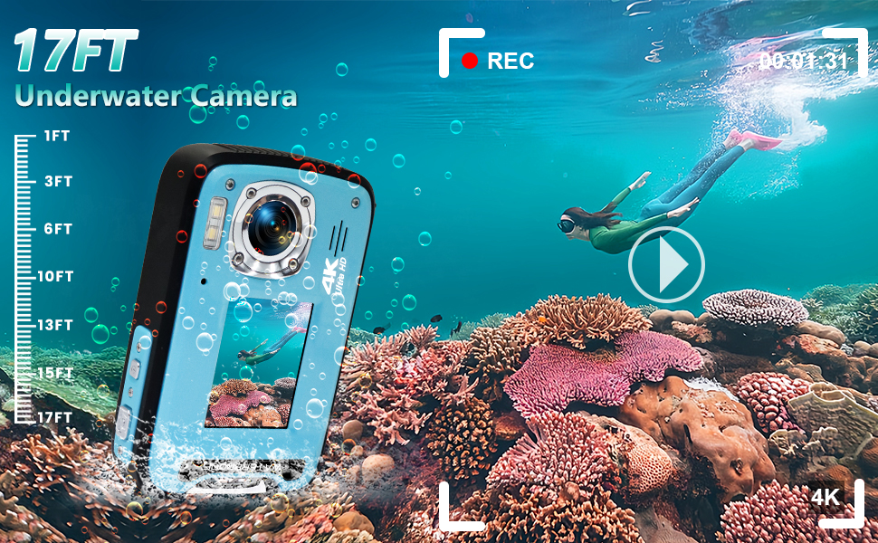 17FT Underwater Camera:This underwater camera is perfect for snorkelling, swimming, surfing and other activities, you can easily record your underwater activities, can be used under 17FT of water (please make sure the battery cover is off before the camera goes into the water)