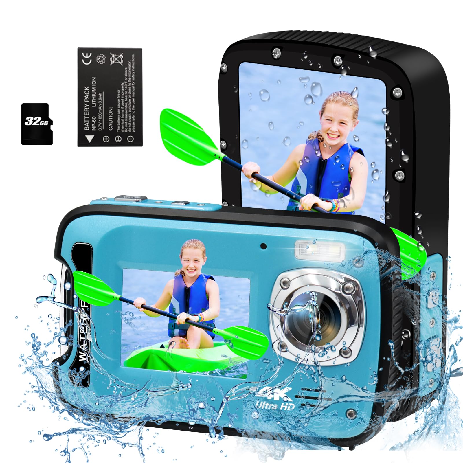 32GB Card & Strong Battery Life:The waterproof digital camera comes with a 32GB memory card, which is already installed in the camera,you don't have to worry about having to buy a separate memory card. With a 1050mAh battery, you won't have to worry about charging the camera too often