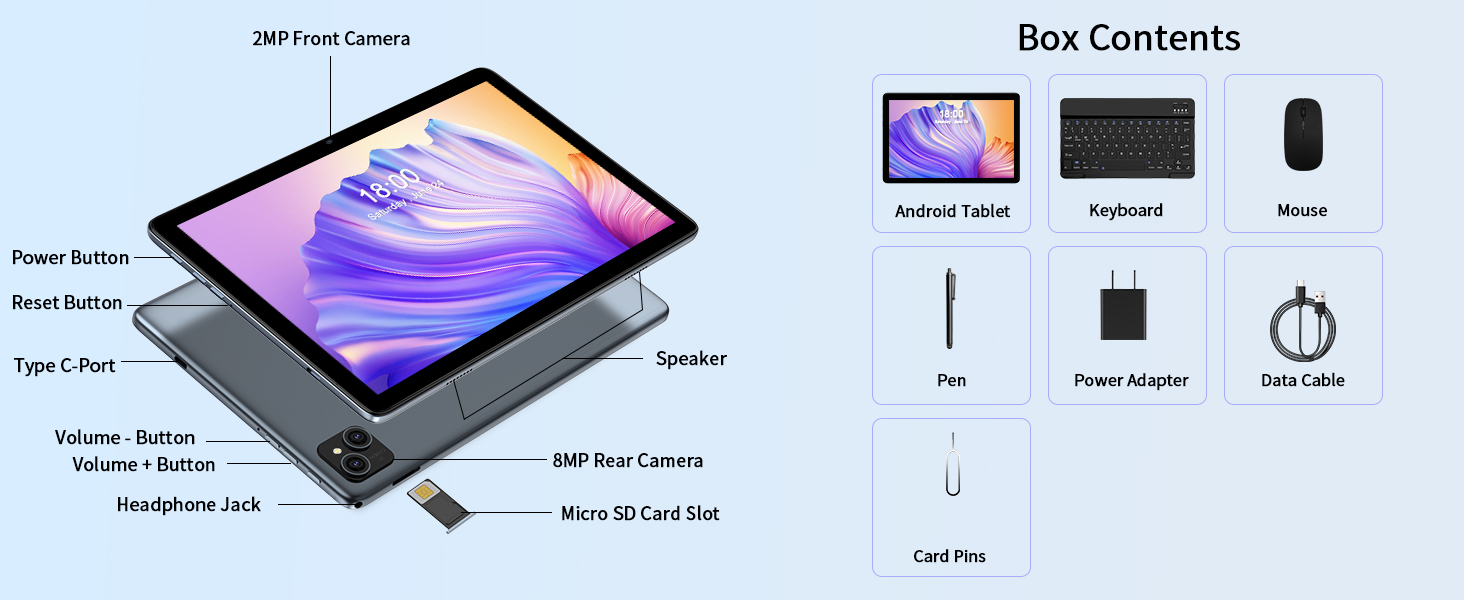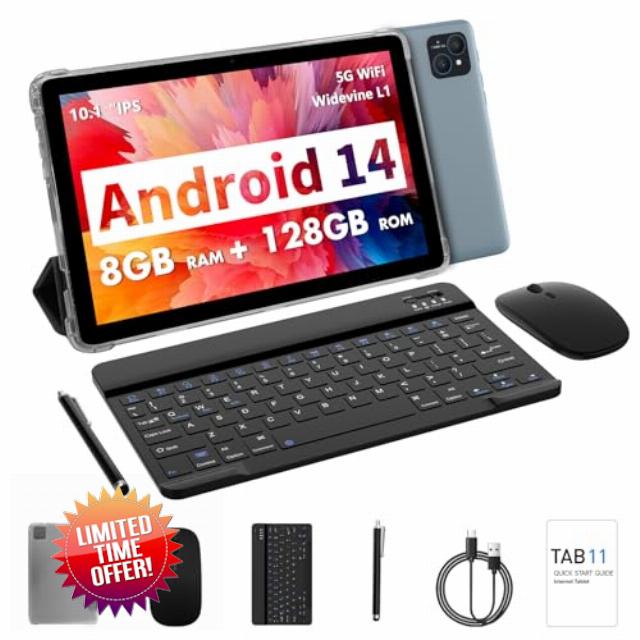 - 【2 In 1 Tablet】The TAB 11 Android 14 Tablet features a 2-in-1 professional work mode with a Bluetooth keyboard, mouse, and a foldable case that's very easy to set up and connect, and you can easily switch between tablet and computer modes. This multi-functional tablet solves the problem of those who need to deal with urgent work while on the go, and the TAB 11 Tablet is a perfect gift for family and friends during the holiday season.Note: TAB 11 tablet does not support SIM card.
