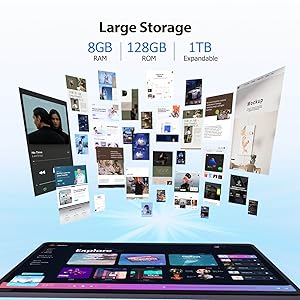 - ✔ 8(6+2)GB RAM + 128GB ROM + 1TB Expandable Storage: tablet android 14 designed to enhance multitasking experience with 8GB (6GB physical + 2GB virtual) RAM configuration for smooth and efficient performance. 128GB internal storage provides ample storage for daily entertainment and work needs, store games, videos, songs, ebooks, phones and important documents, expandable up to 1TF via TF card, ensuring favorite apps, files and media safely stored.