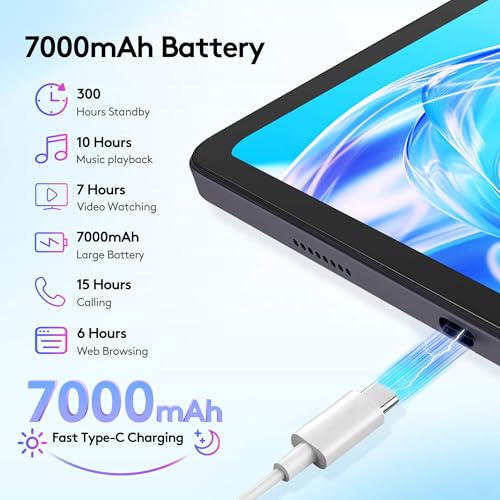- ✔ 7000mAh Large Battery: powerful battery in tablet android, ensuring long-lasting performance with enduring power for all your daily task. Perfect for short trip, entertainment on the go. It offers extended usage time for reading, web browsing, video watching and music listening, say goodbye to any battery anxiety. The Type-C charging port ensures each quick charging.