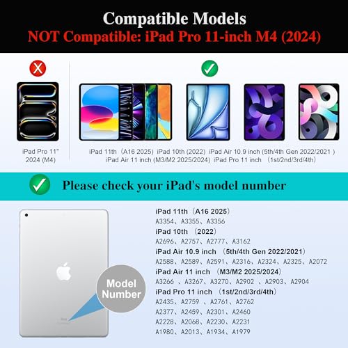 - iPad 11 Inch Case with Keyboard:Tailor-made for iPad 11th Gen A16/10th Gen,iPad Air 11 M2/M3,iPad Pro 11 inch 4th/3rd/2nd/1st Gen,iPad Air 5th/4th Gen 10.9 inch.Important:Please check your iPad model before purchase! Models include:A3354, A3355, A3356, A2696, A2757, A2777, A3162, A3266, A3267, A3270, A2902, A2903, A2904, A2435, A2759, A2761, A2762, A2377, A2459, A2301, A2460, A2228, A2068, A2230, A2231, A1980, A2013, A1934, A1979, A2588, A2589, A2591, A2316, A2324, A2325, A2072