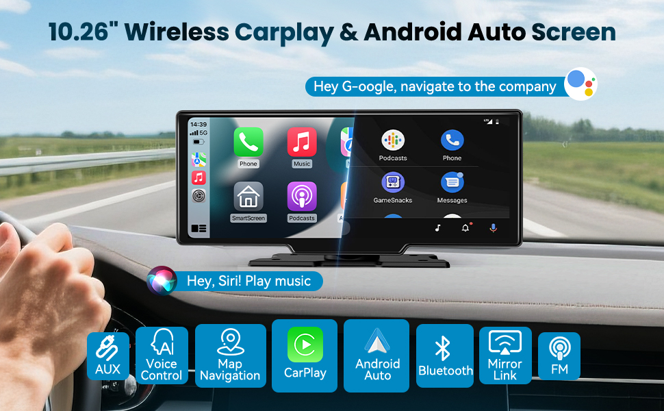 - 【Carplay Screen & Android Auto Screen】Our carplay screen for car not only supports wireless connection of Carplay, but also supports wireless connection of Android Auto (support mobile phone system IOS 10+ and Android 11+). After connecting to Carplay or Android Auto through the phone's Bluetooth, you can use the phone's map navigation, voice control, music playback, call answering and other functions
