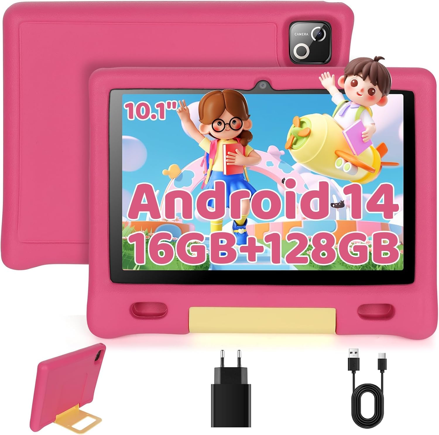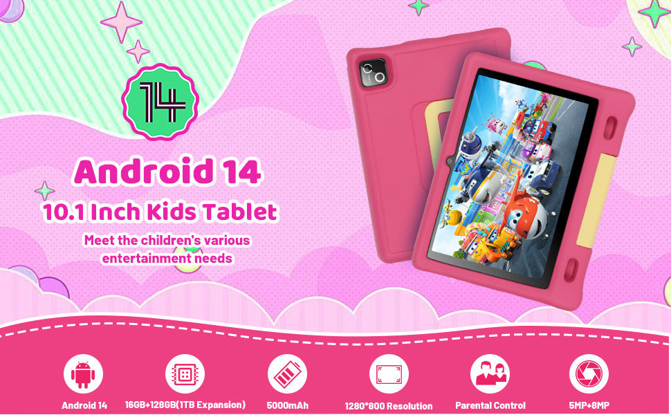 10 Inch Kids Tablet, Android 14 tablet for kids with Octa Core Processor, 16GB RAM 128GB ROM 1TB TF, 5000mAh Battery, WiFi, Bluetooth, Type-C, Kids Tablets with 8+5MP Dual Camera (Pink)