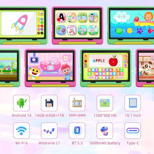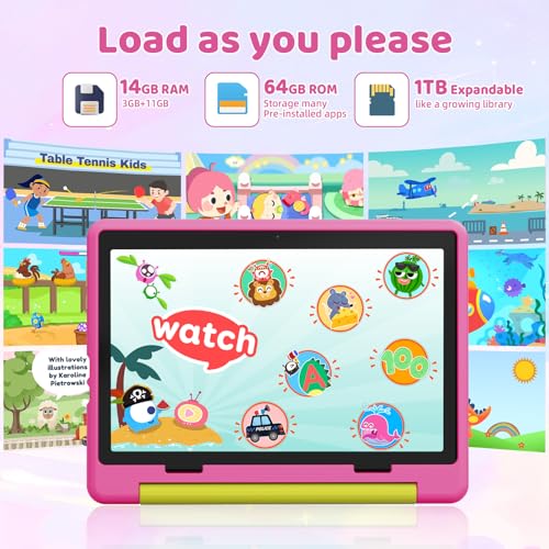 - 【Kids Tablet with 14GB + 64GB + 1TB Large Capacity】This tablet for kids is equipped with 14GB RAM (3GB physical memory+11GB virtual expansion) and 64GB high-speed storage space, running smoothly and easily handling multitasking, learning, reading, watching movies and games. More support for microSD card expansion (card needs to be purchased separately, up to 1TB), massive storage space for photos, e-books, movies and other resources at will, no need to worry about insufficient space.