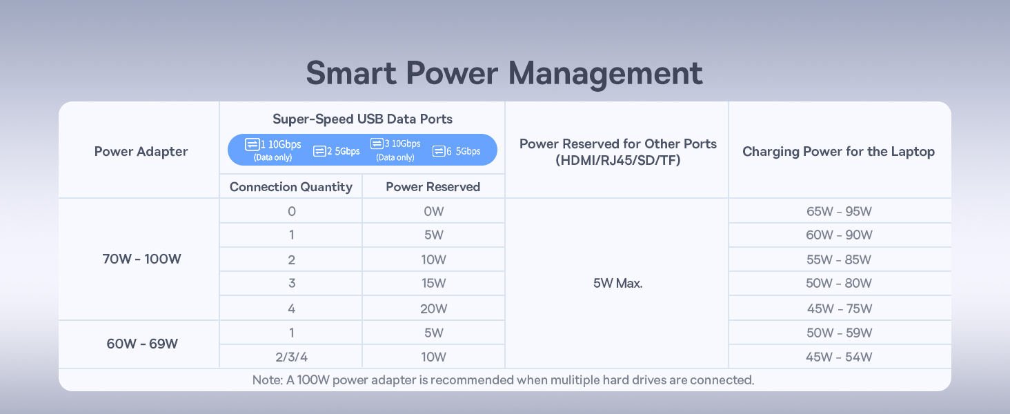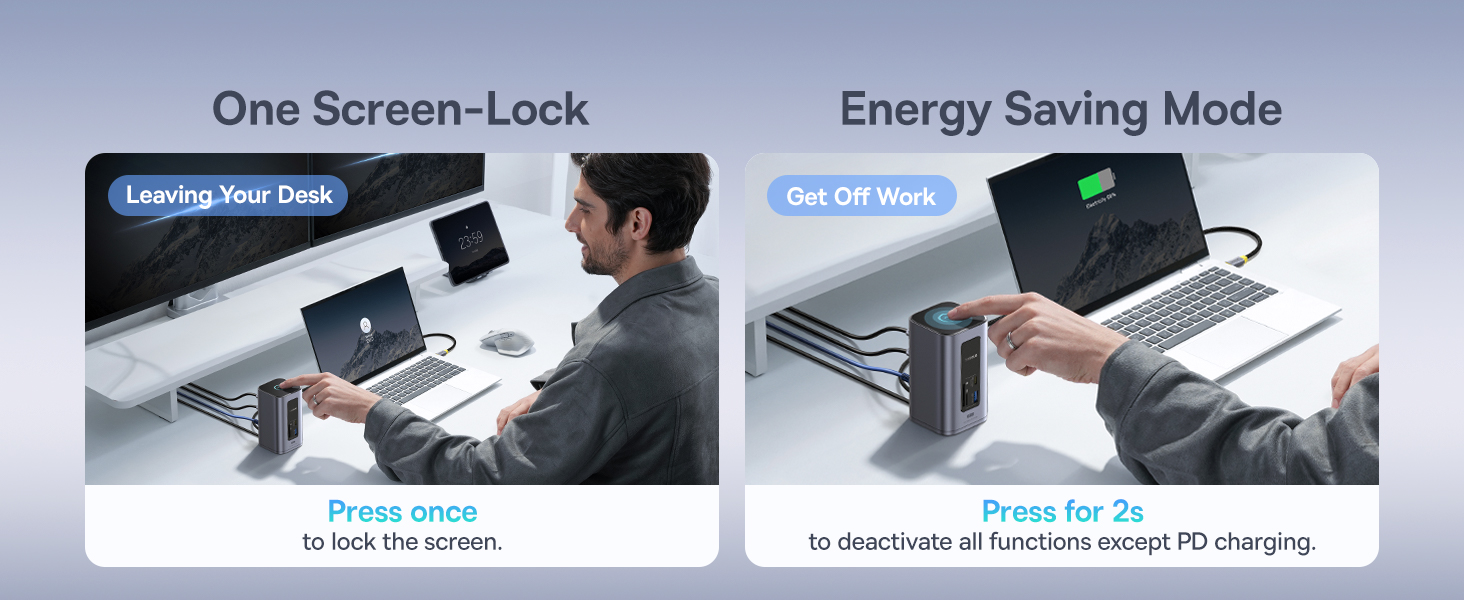 - 【Innovative Smart Energy Saving Mode】When you're out and about, simply press the top button for 2 seconds to activate this mode, and the laptop dock will intelligently disconnect all ports except the PD port, keeping your laptop charged, giving you peace of mind and long-lasting power.