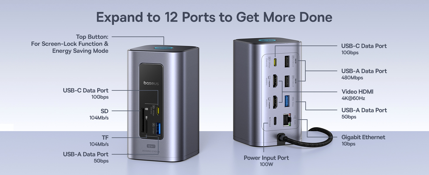 - 【12 in 1 Docking Station】 Say goodbye to cable clutter and embrace simplicity with our all-in-one usb c docking station! Featuring dual 4K outputs, 6 USB ports, and more, this powerhouse consolidates your workspace while unlocking seamless connectivity for all your devices.