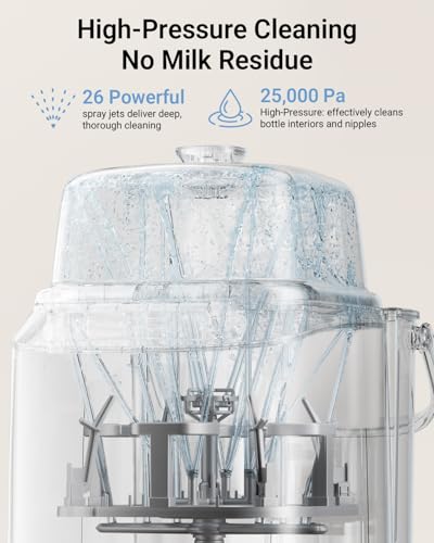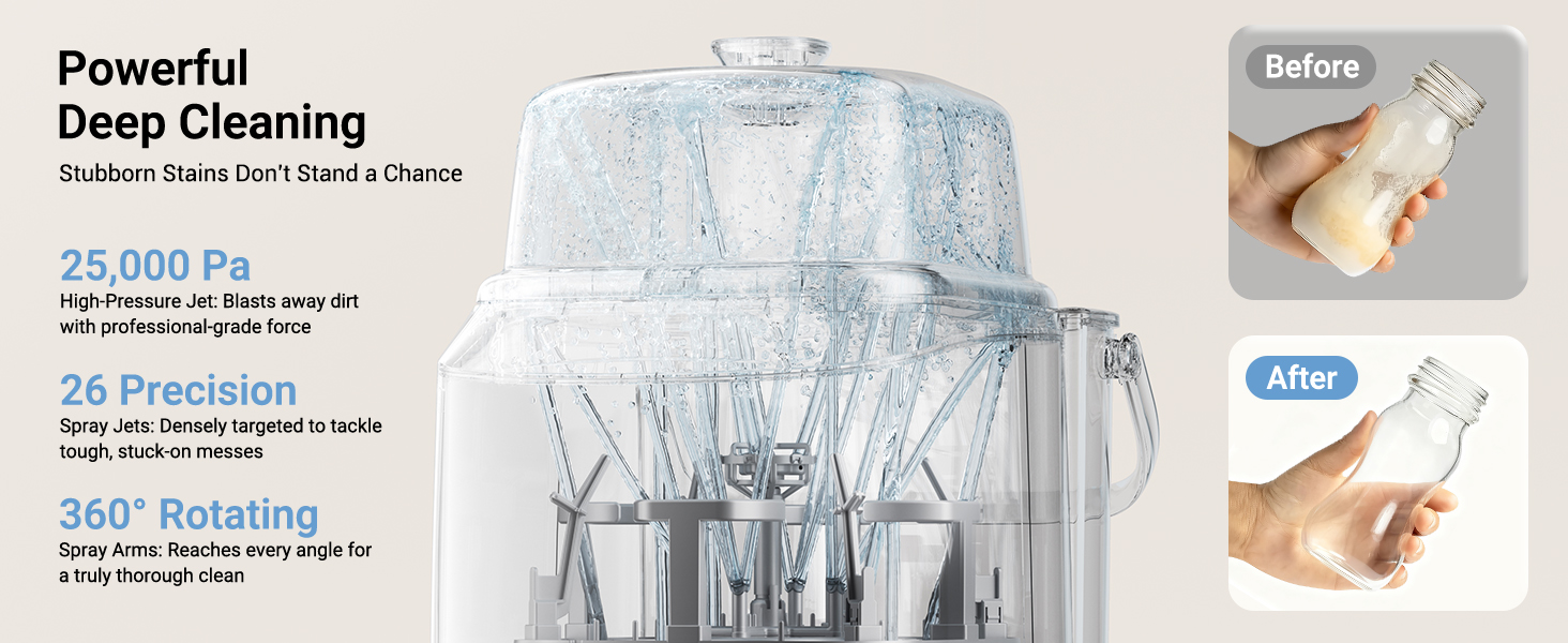 - 26 POWERFUL SPRAY JETS FOR FLAWLESS 360° CLEANING: With 12 precise interior spray jets and 14 swirling exterior jets, Bear’s high-pressure spray system (25,000 Pa) ensures deep cleaning of bottles, pump parts, and accessories—removing even stubborn milk residue. Uses 94.7% less water than manual washing