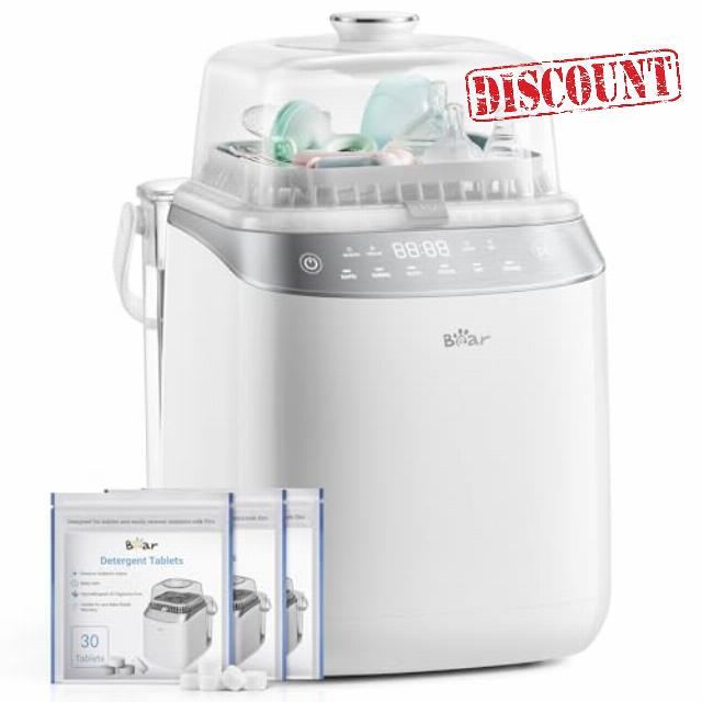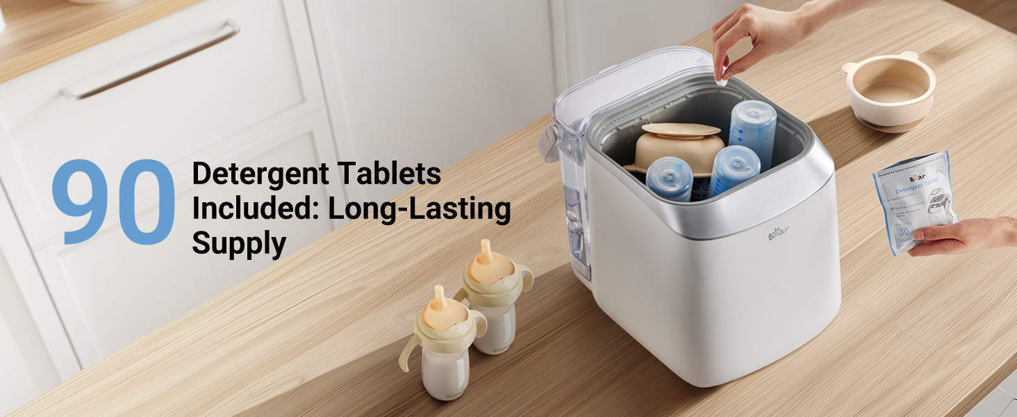 - PEACE-OF-MIND SAFETY & PREMIUM INCLUDES: BPA-free construction with auto-shutoff and overheat protection; backed by a 1-year warranty. The Bear Bottle Washer and Sterilizer and Dryer comes with 90 official Bear detergent tablets – double the competition's supply for months of worry-free use.