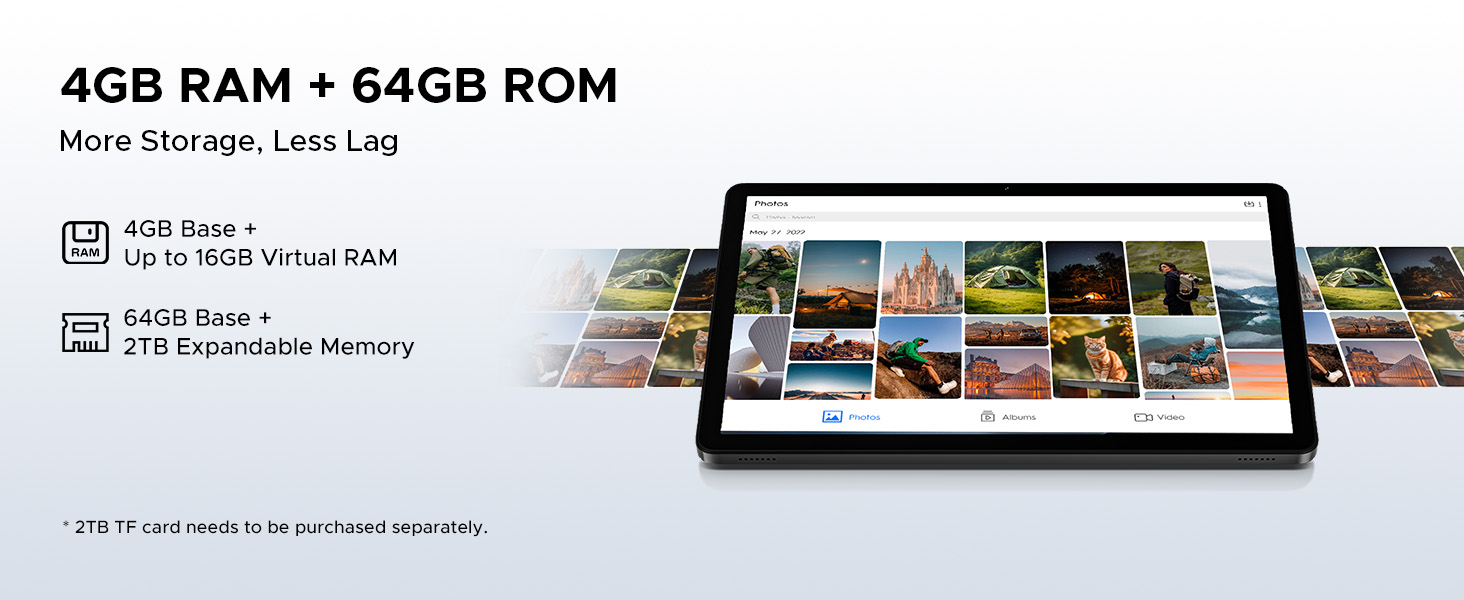 - 【 T7200 Octa Core & 20GB + 64GB/2TB LPDDR4X】The tablets android 11 inch features a T7200 octa-core processor built on advanced 12nm technology, with a maximum clock speed of 2.0GHz. It handles multitasking and runs mainstream high-frame-rate games with ease. Equipped with 20GB of RAM and LPDDR4X memory, doogee tablet ensures smooth switching between apps. With 64GB of storage (expandable up to 2TB), you can store all your data, shows, and games without worry. File transfers and system updates are no longer a long wait.