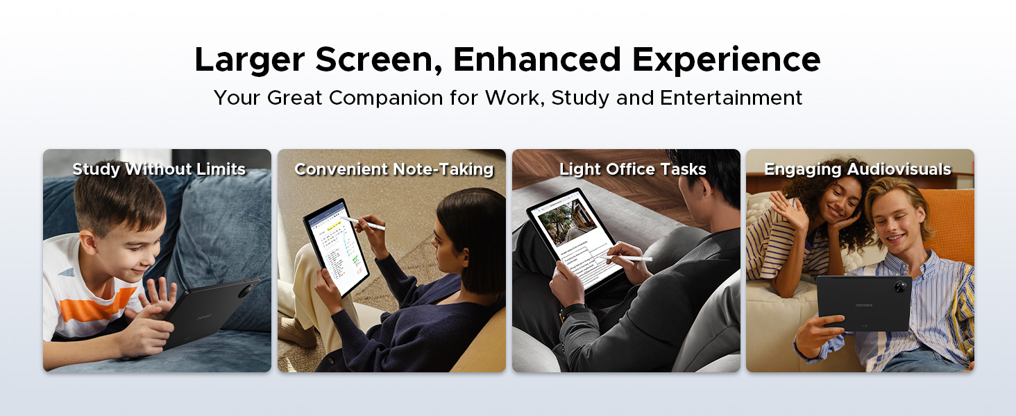 - 【8580mAh Large Battery + 7.9mm】The 11 inch tablet boasts an 8580mAh ultra-high capacity battery, delivering up to 12 hours of continuous video streaming or 15 hours of music playback! Combining this massive battery with an ultra-slim 7.9mm profile—thinner than a magazine—DOOGEE TAb A9+ fits comfortably in one hand without any burden. Easily slipping into a small bag, it's the perfect companion for long commutes, business trips, and travel adventures.