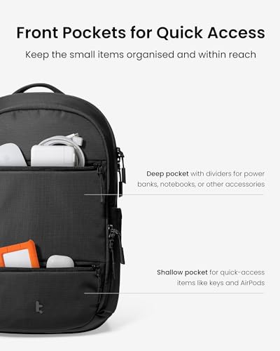 - 22L Smart Organization: With a 22L capacity, this backpack provides ample storage without the bulk. Two front accessory pockets neatly organize small essentials, while an inner mesh pocket for private items. Dual side pockets hold a water bottle or umbrella, and a dedicated tech zone offers padded sleeves for both a 16" laptop and a 13" tablet, ensuring safe carry for all your devices