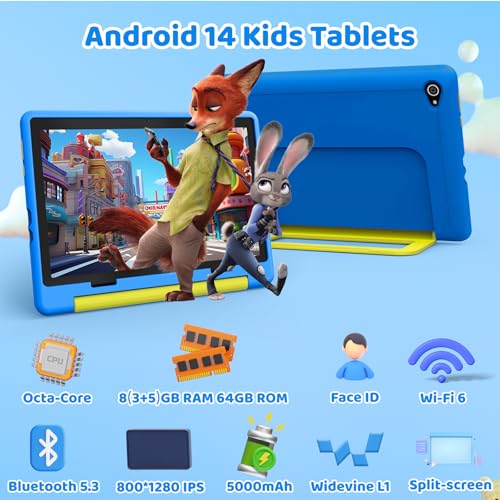 - 【Android 14 tablet with 8(3+5)GB+64GB+1TB memory】: The kids tablet 10.1 inch has been further improved and has open and personalized settings as well as more extensive privacy settings. This android 14 tablet for kids is equipped with 8GB RAM and 64GB ROM. 64GB of storage space is enough to store your favorite movies, photos and apps. The Android 14 kids tablet also supports up to 1TB TF card to expand memory and provides additional storage space for more data and files.