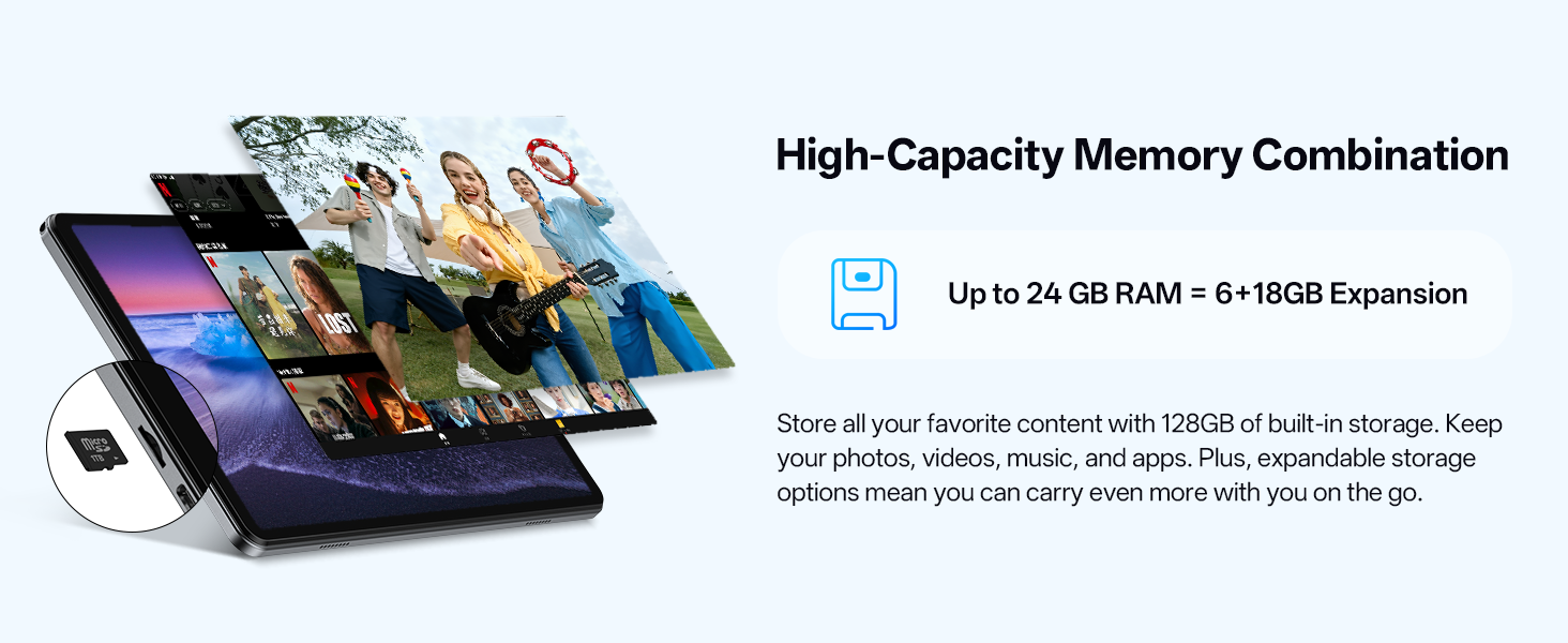 - Ample Storage & Memory – With 128GB of built-in storage—expandable up to 1TB via TF card—this tablet offers abundant space for your movie collections and family photos. Its 24GB LPDDR4 memory (6GB physical + 18GB virtual) enables smooth multitasking and instant content access.