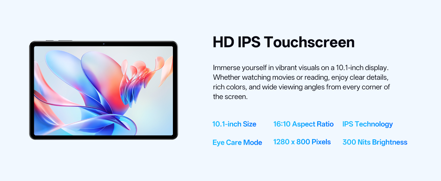 - Vivid Eye-Comfort Display – The 10.1-inch IPS HD screen delivers clear and vibrant visuals, ideal for video watching, web browsing, and comfortable reading. An Eye Comfort mode with adjustable color temperature effectively reduces blue light emission during extended use.