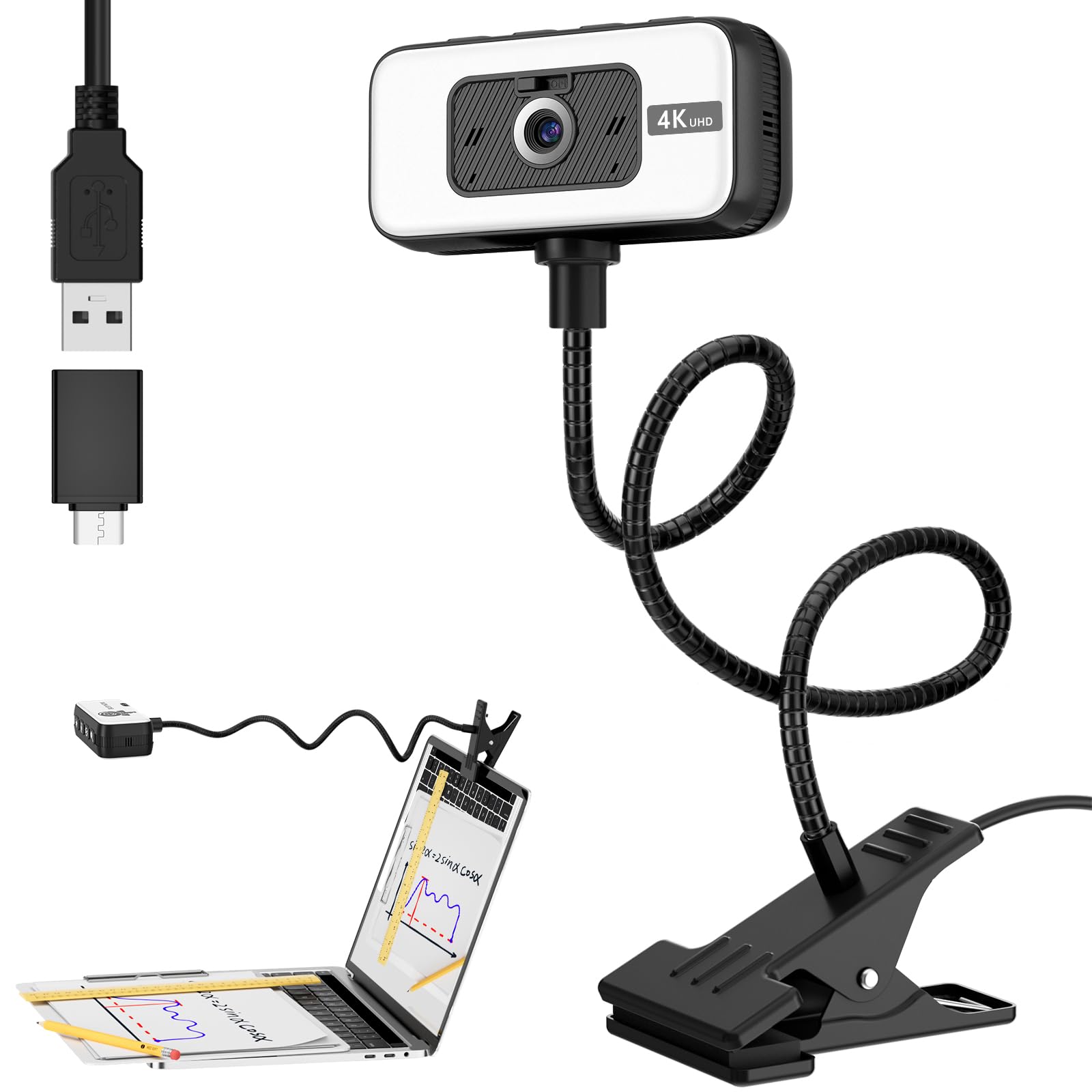 - 【Intelligent dimming】The web camera for laptop with light built in six levels of brightness (3 levels of warm light, 3 levels of white light), With a flexible goose neck and 4K clarity, this webcam is your perfect teaching partner. At home, it provides a stable overhead view for guiding your child through homework. In class, it automatically focuses to vividly showcase seedling growth in agriculture or the precise steps on a baking station. Its smooth rotation allows effortless switching between a full-body view for student yoga and a top-down projection of worksheets. The built-in fill light ensures perfect visibility in any setting.