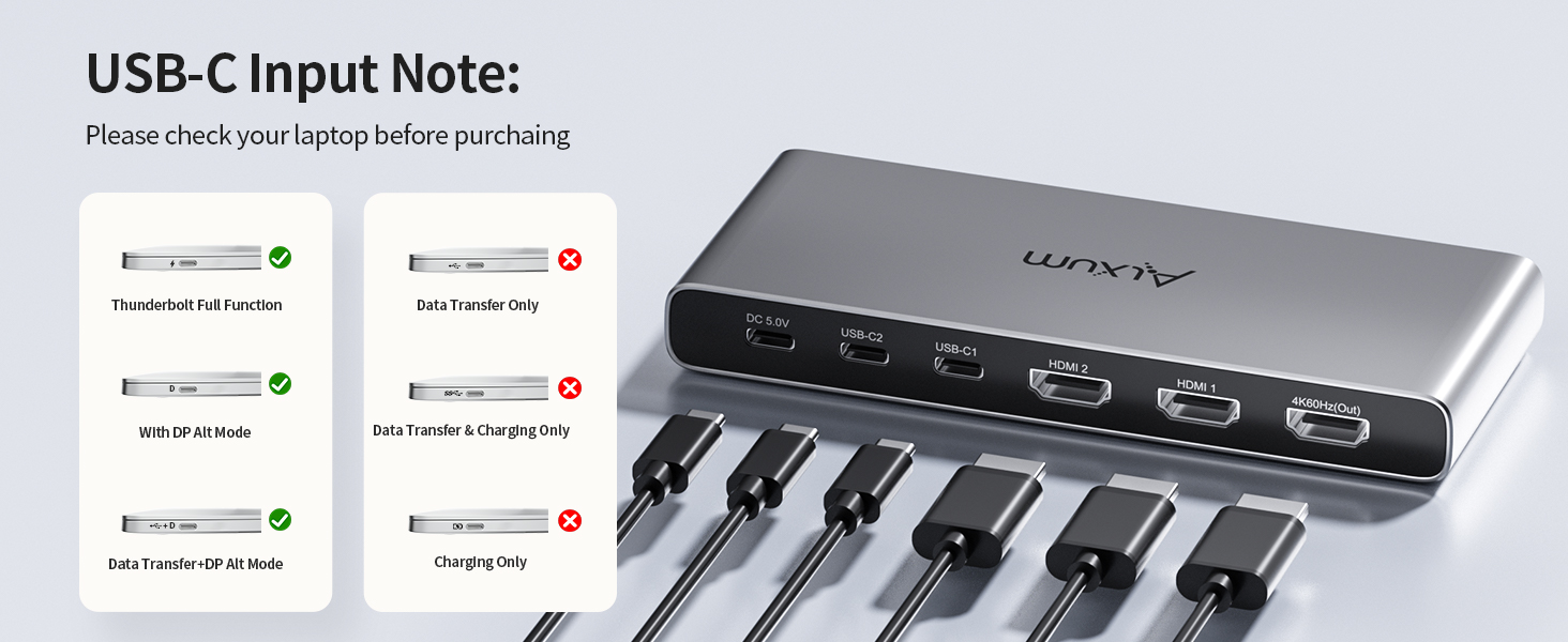 - Packaging includes: 1×4K60Hz 2× HDMI + 2× Type-C to HDMI Switches, 1× USB 5V2A Power Adapter, 1×1.5M USB 2.0 AM to CM Cable