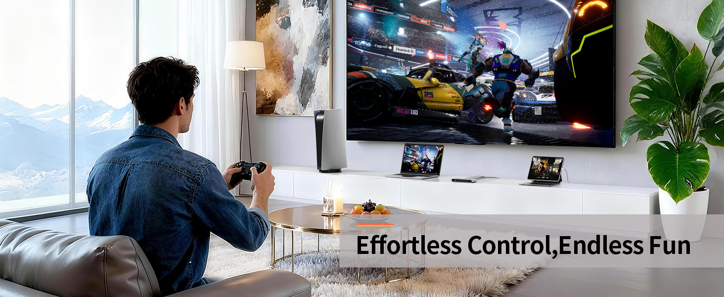 Connect your PS5, TV Box and more to your main display. Enjoy smooth, tear-free gaming with VRR, FreeSync, and G-Sync compatibility
