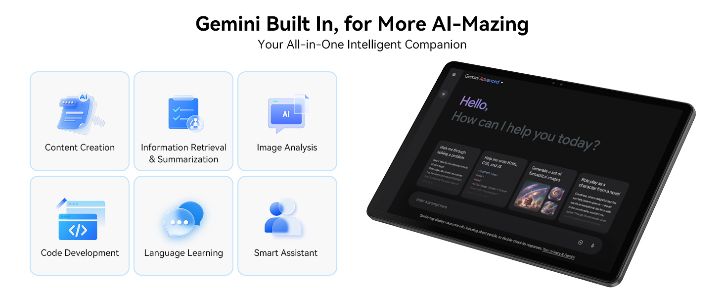 - Meet your creative co-pilot: built-in AI. This AI tablet features Gemini AI, your intelligent assistant for writing, brainstorming, and organizing. Need to draft an email or plan a project? Just ask—and make every task feel effortless.