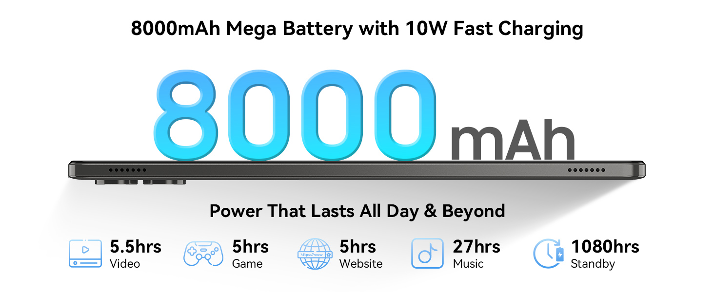 - All-day power, no compromises. The colossal 8000mAh battery keeps this 11 inch tablet going through meetings, trips, or streaming marathons. And when it’s time to recharge, fast charging gets you back up quickly.
