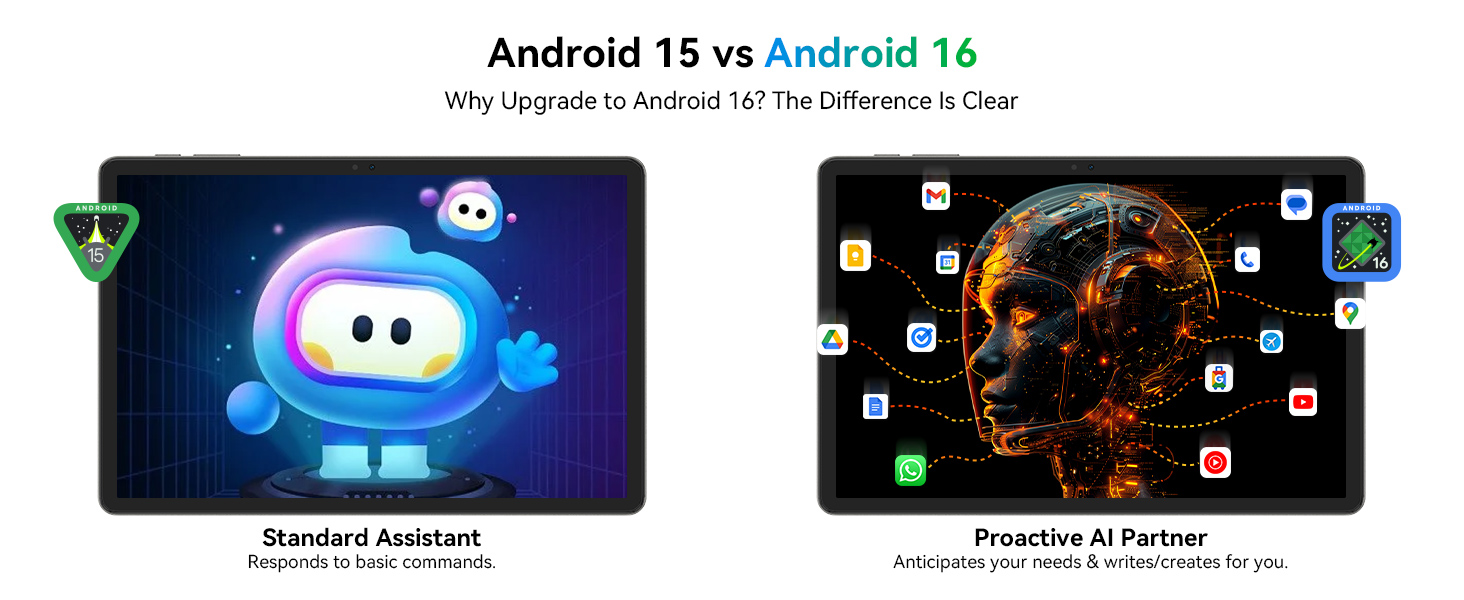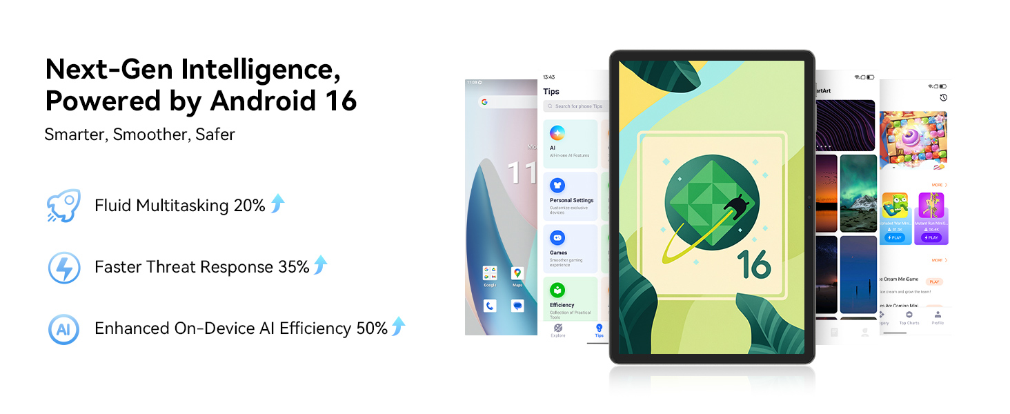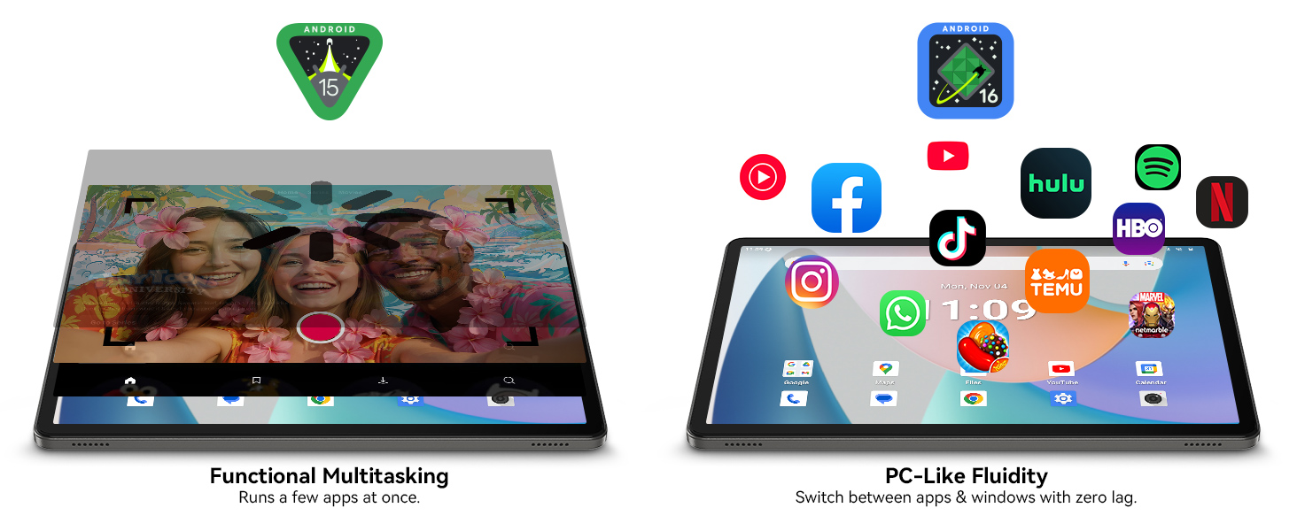 - Share power on the go. With OTG reverse charging, this Android 16 tablet doubles as an emergency power source. Quickly juice up your phone, earbuds, or any USB-C device when you’re away from an outlet.