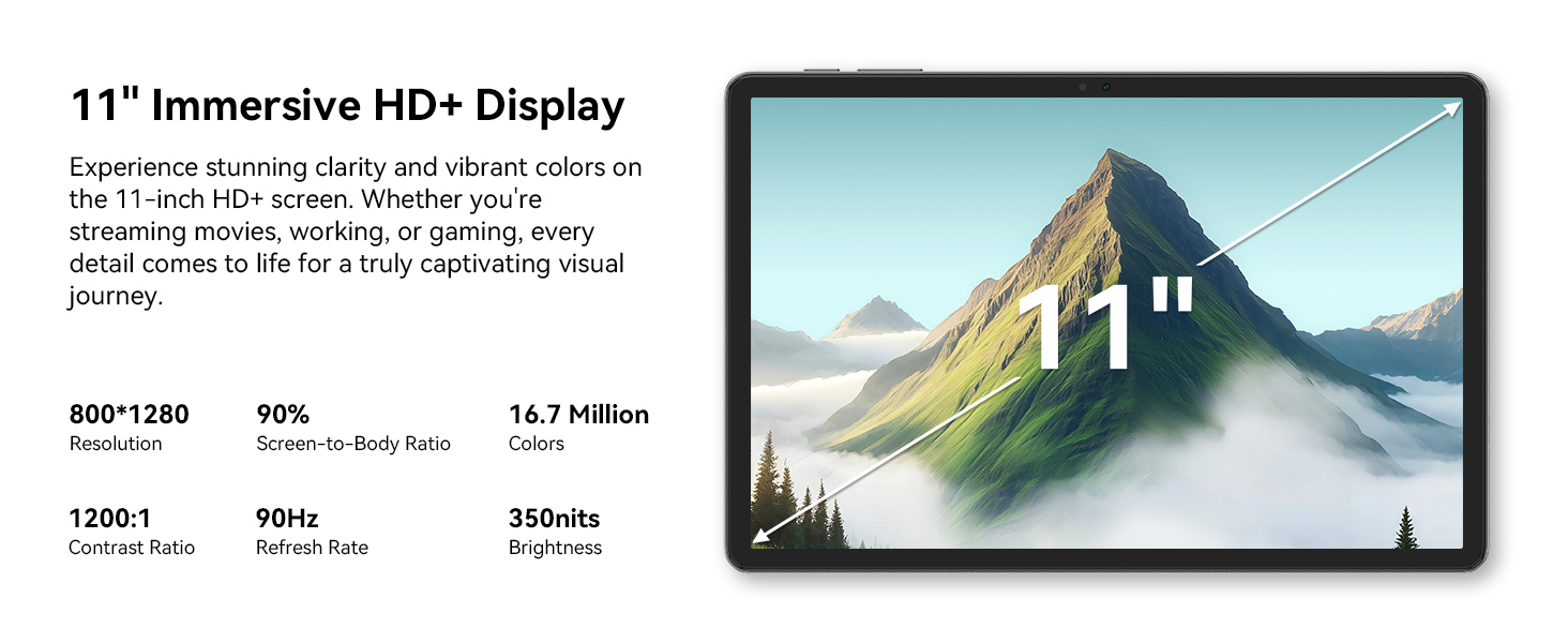 - Watch, play, and scroll in fluid detail. The stunning 11 inch tablet features a 90Hz display that brings movies and games to life with incredibly smooth visuals. Say goodbye to jerky motion and blurry scenes—every swipe and scene is a delight on this vibrant screen.