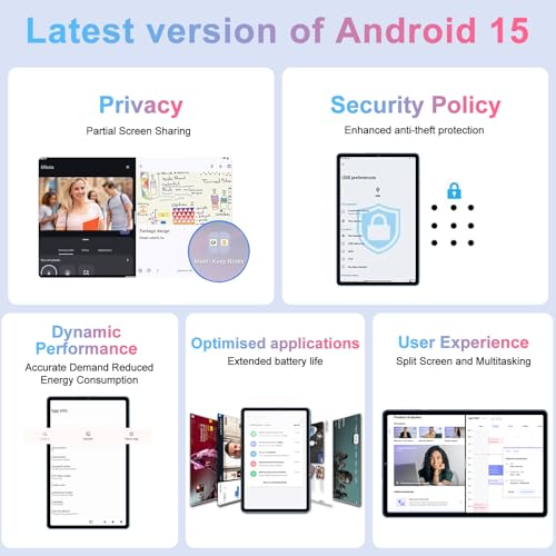 - 【5G WIFI 6 + BT 5.0】This Android 15 tablet supports advanced Wi-Fi 6 technology, compatible with both 2.4GHz and 5GHz dual-band Wi-Fi for a faster, more stable experience. Whether for online learning, video conferencing, or smooth, lag-free gaming, it ensures uninterrupted performance. Equipped with Bluetooth 5.0 technology, it delivers faster, more stable data transmission. Effortlessly connect headphones, speakers, and other smart devices.