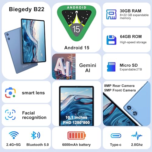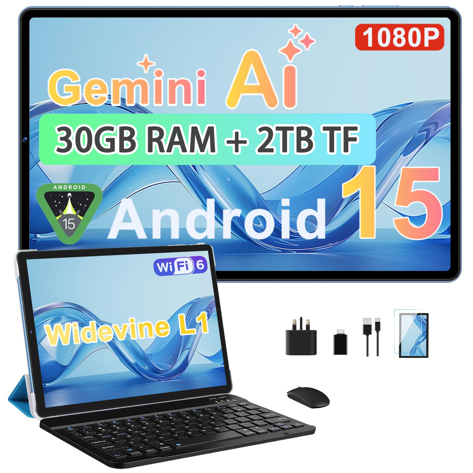 Biegedy 2026 Newest Tablet 10 Inch Android 15, Gemini AI, 30GB RAM + 2TB TF, 6000mAh,Octa-Core,Widevine L1,WiFi 6,5 MP + 8 MP,1280 * 800 Pixels,GMS,Bluetooth 5.0, Tablet with Keyboard and Mouse – Blue